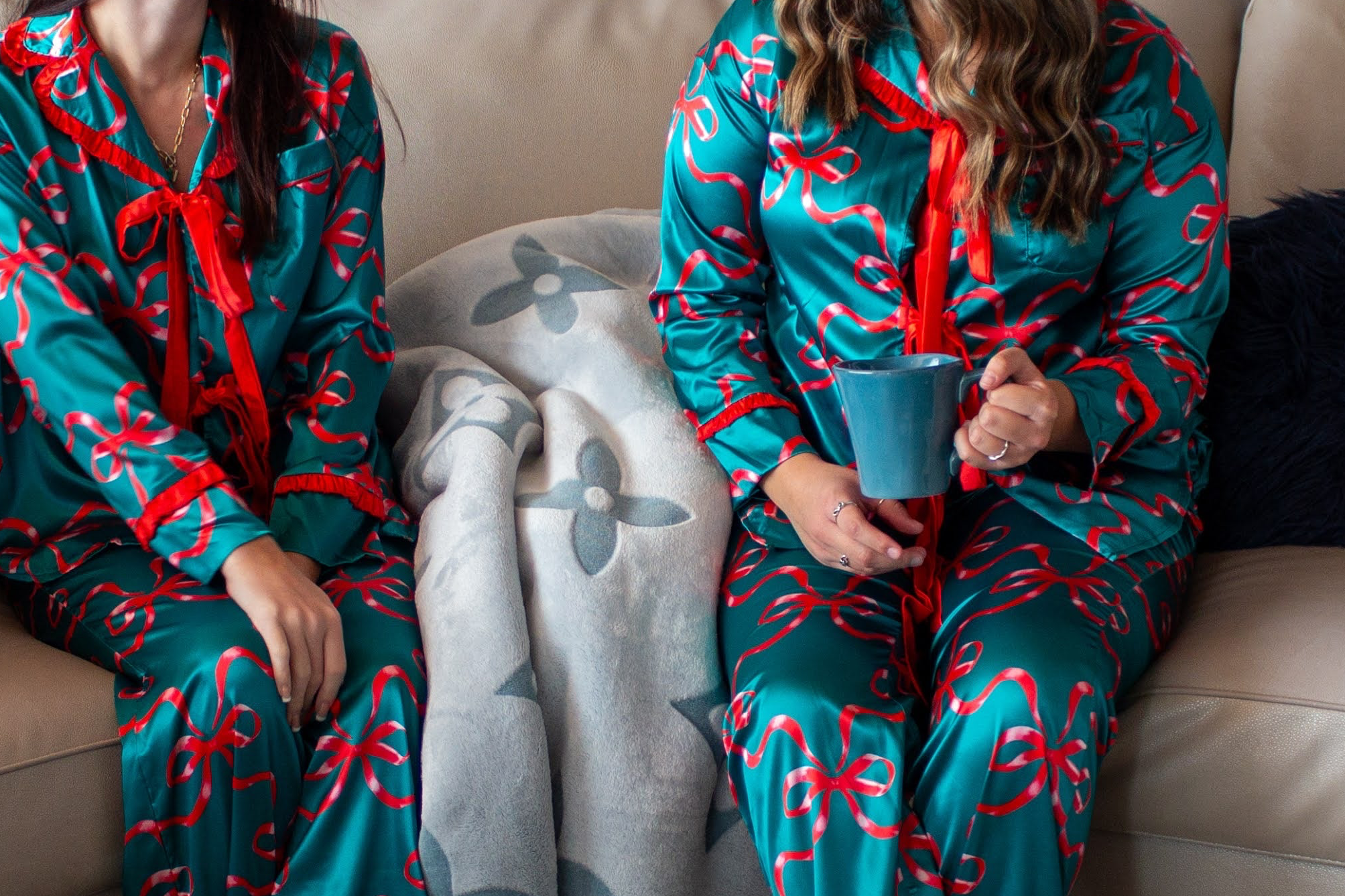 Get in the holiday mood with these gorgeous green satin style pajamas featuring red ribbon bows throughout the fabric. The top features a red ruffle edged collar, long sleeves with matching ruffle, one shirt front pocket and two red ribbons for a tie closure.