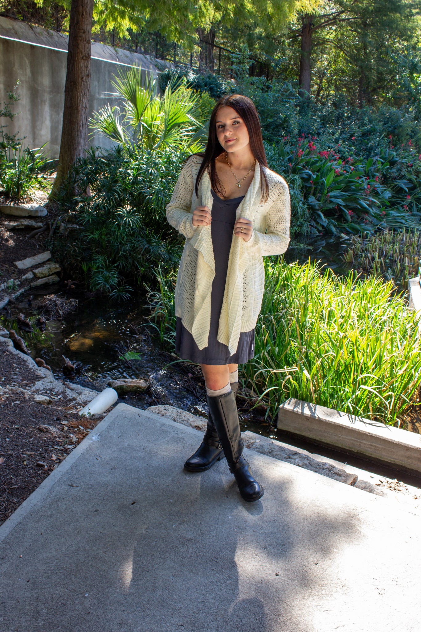 Cozy knit cream color cardigan with open front, below the waist hem and a variety of knit patterns for style.