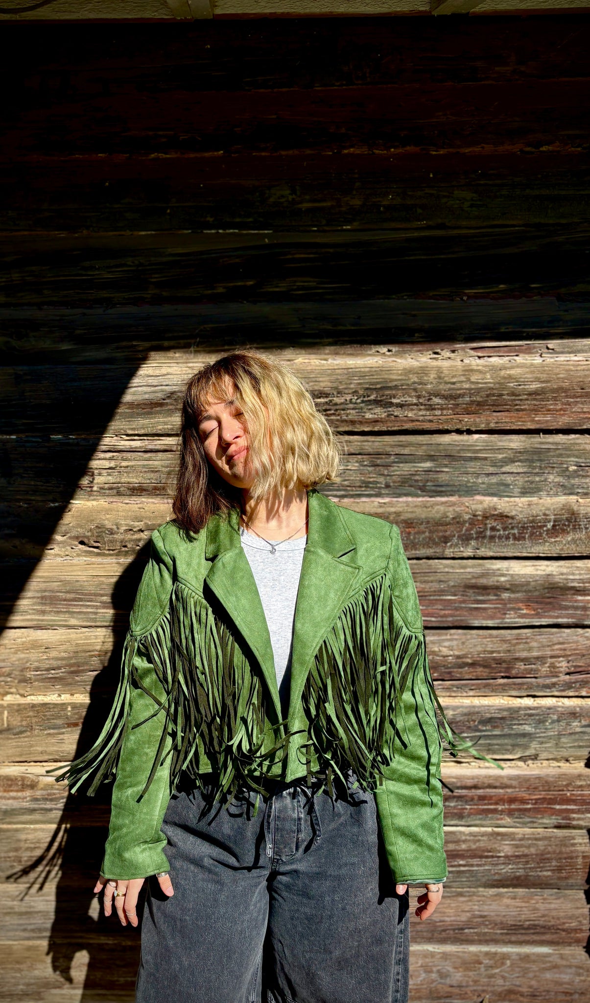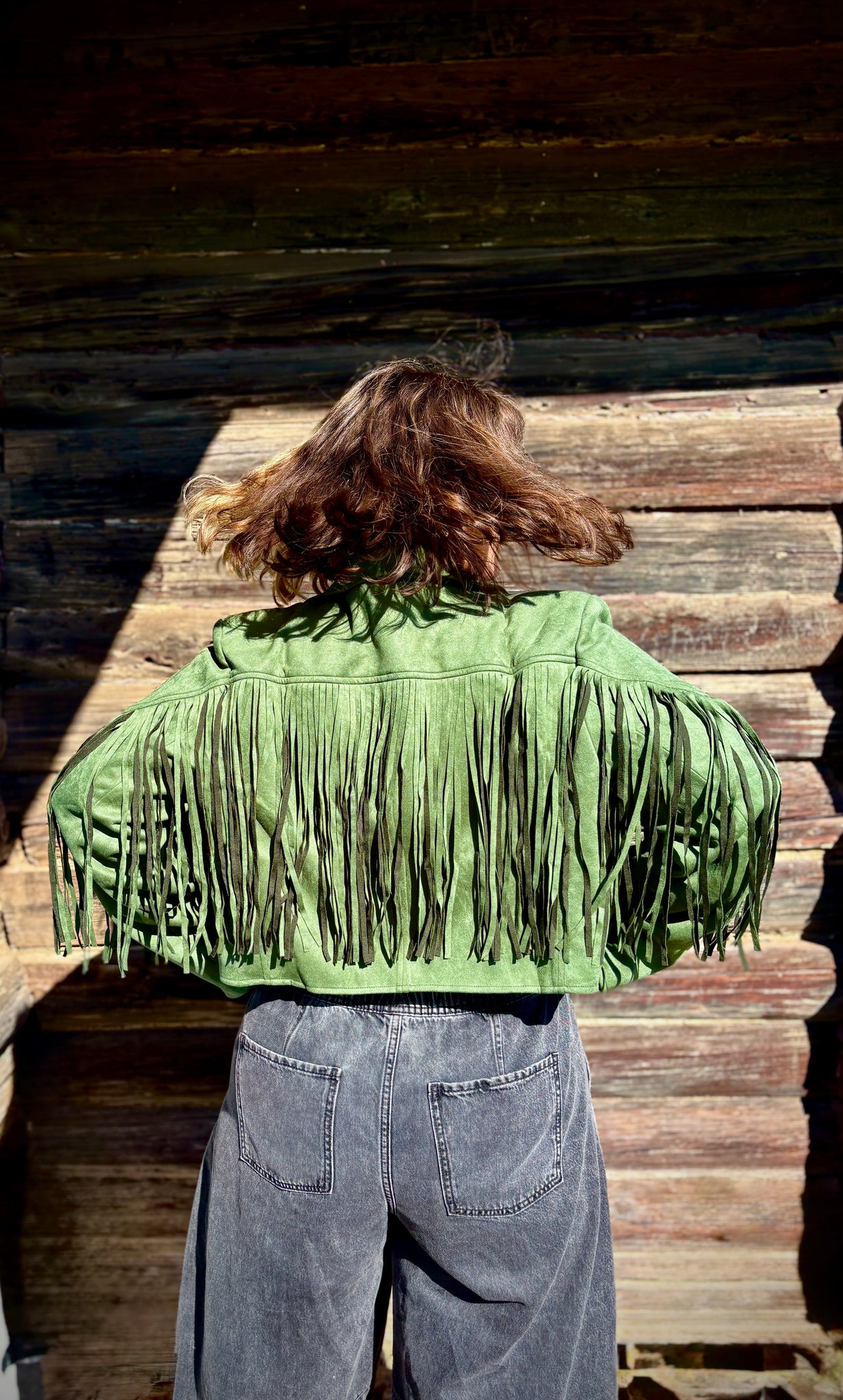 Faux Suede crop jacket with a collared neckline, long sleeves, open front, fringe trim and fully lined in a rich green color.