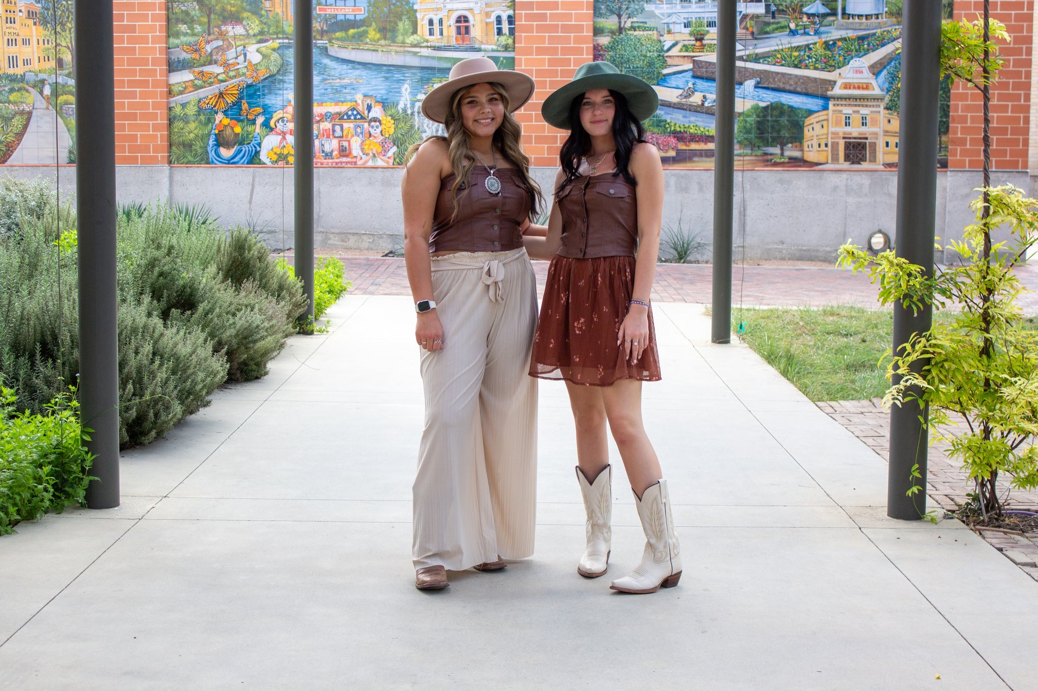 Brown floral pleated mini swing skirt featuring elastic waistband for a comfortable fit, fully lined for modesty, perfectly paired with boots for fall outings.