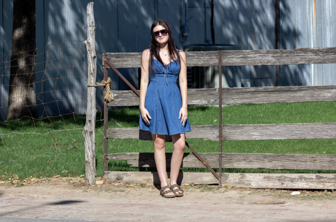 Medium wash denim, corset style dress with adjustable 1inch shoulder straps, front corset tie and back elastic for a more fitted look, A-line mini length hem.