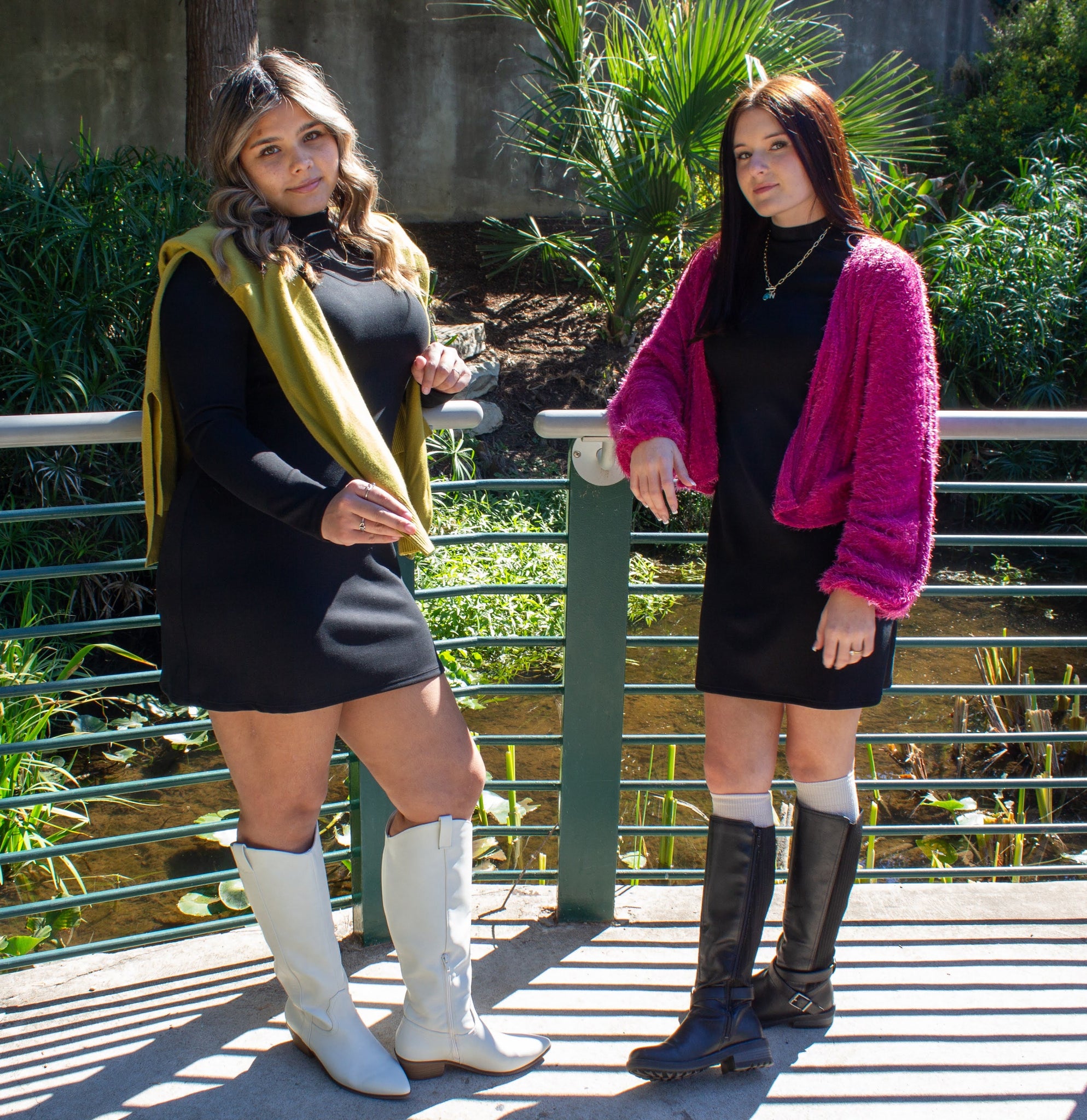 Super soft black knit fabric make this dress a dream to wear, featuring long sleeves, high neckline, a fit and flair bodice with an above the knee hemline.
